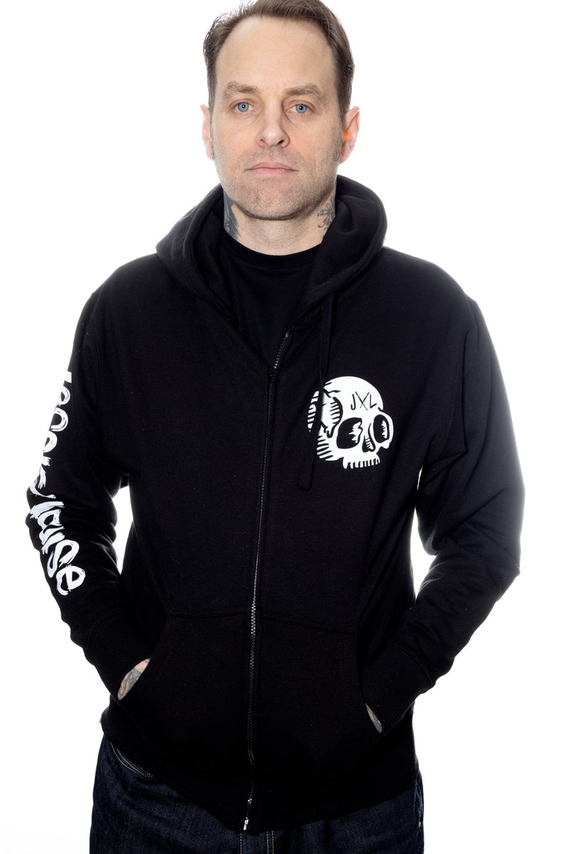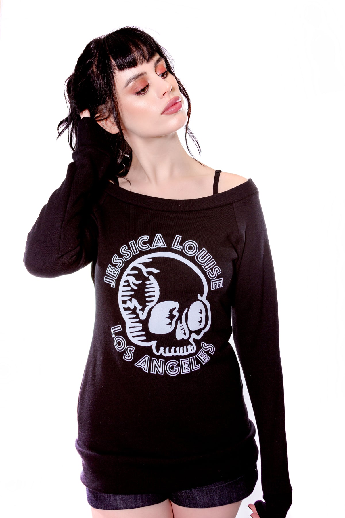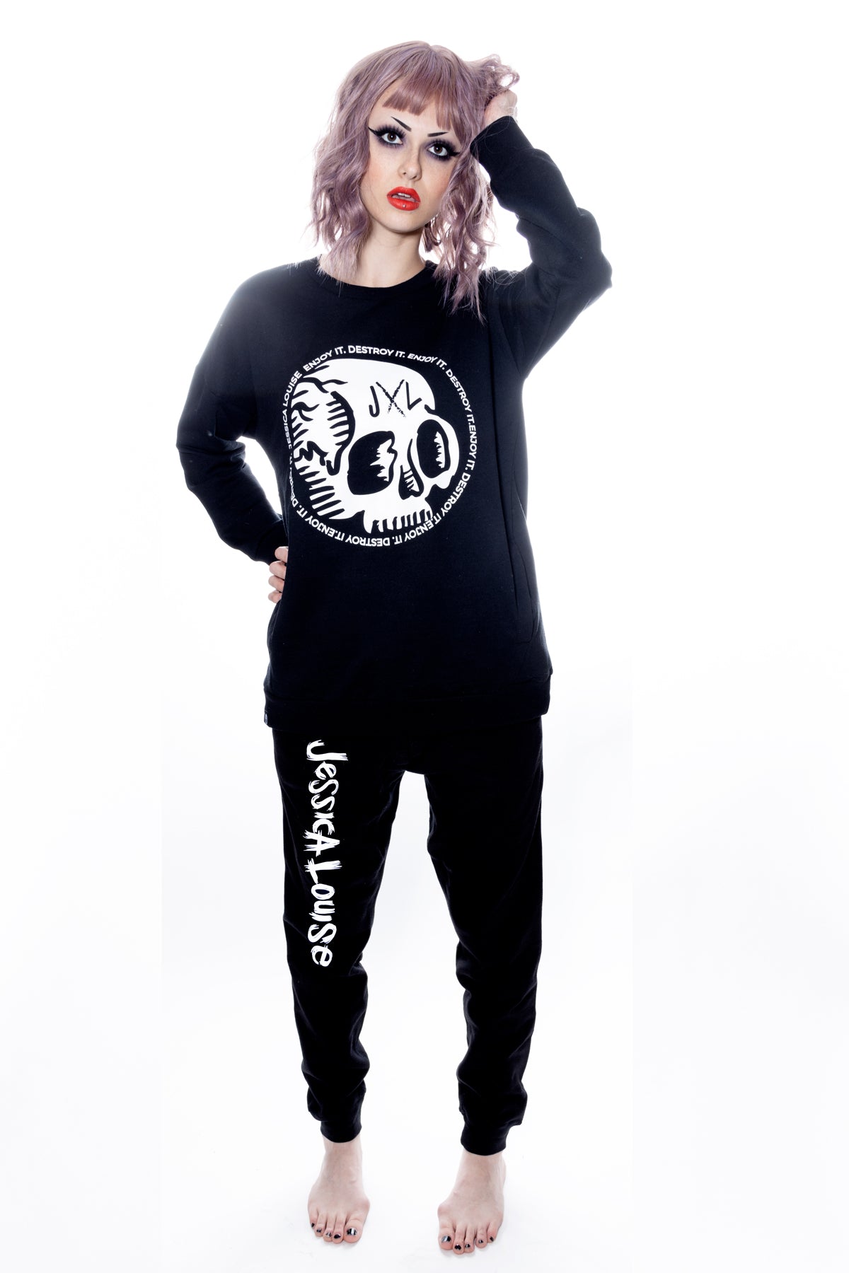 Front skull JL print, Large back skull logo and Jessica Louise custom lettering logo sleeve print. Black cotton. S-XL