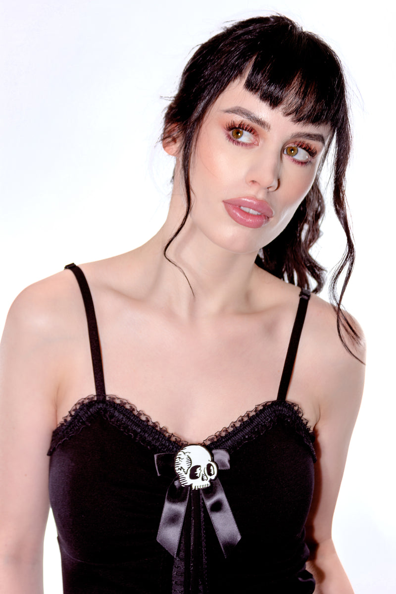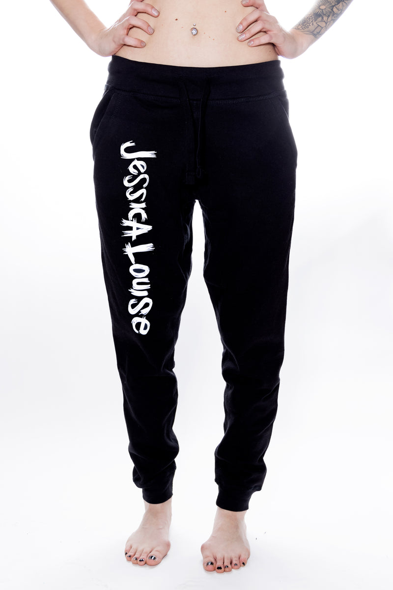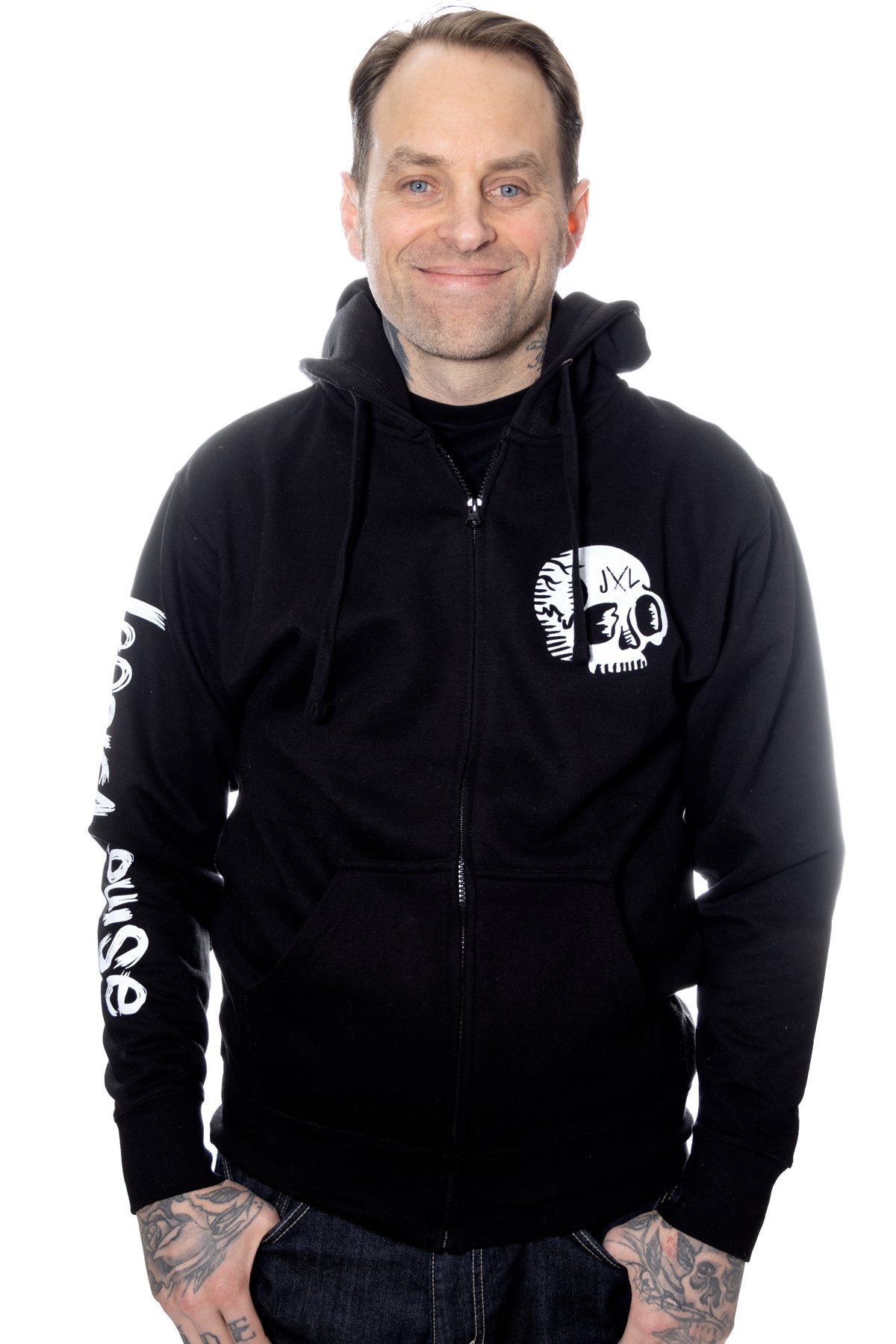 Front skull JL print, Large back skull logo and Jessica Louise custom lettering logo sleeve print. Black cotton. S-XL