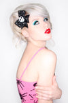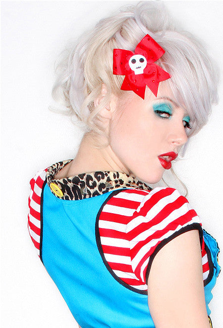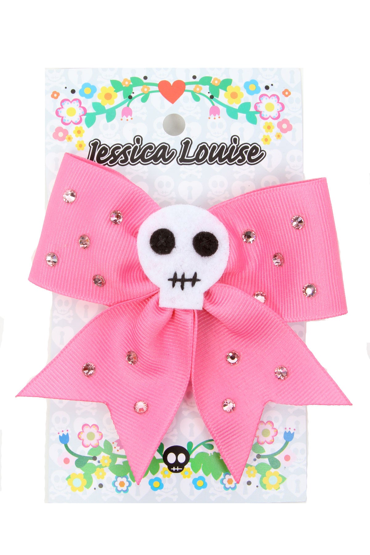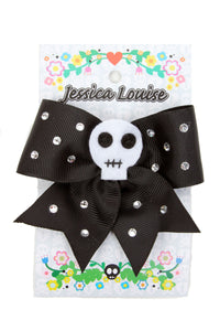 Crystal skull bows made of soft hand tied grosgrain ribbon then embellished with hand set crystals and center signature felt skull.