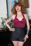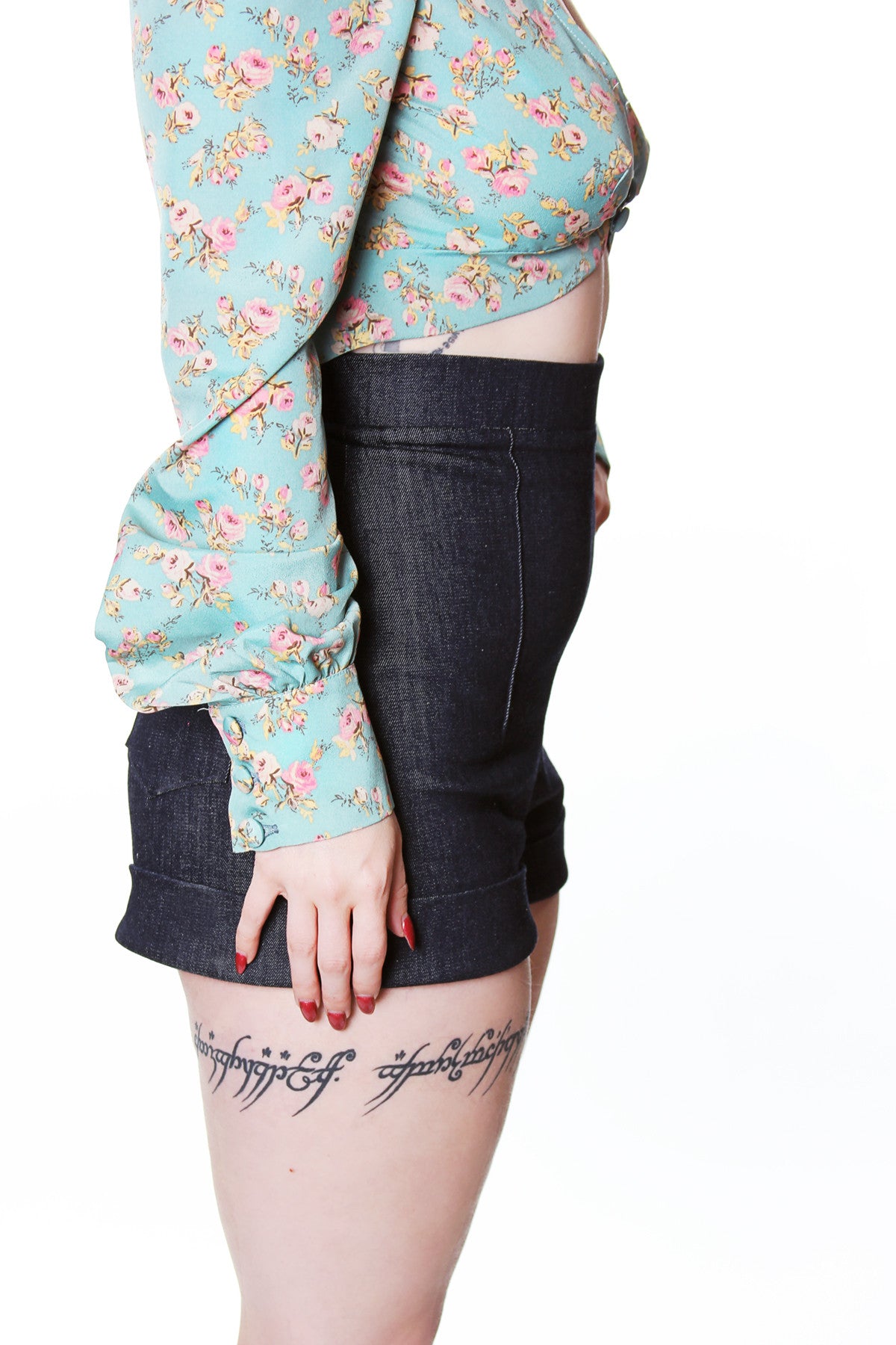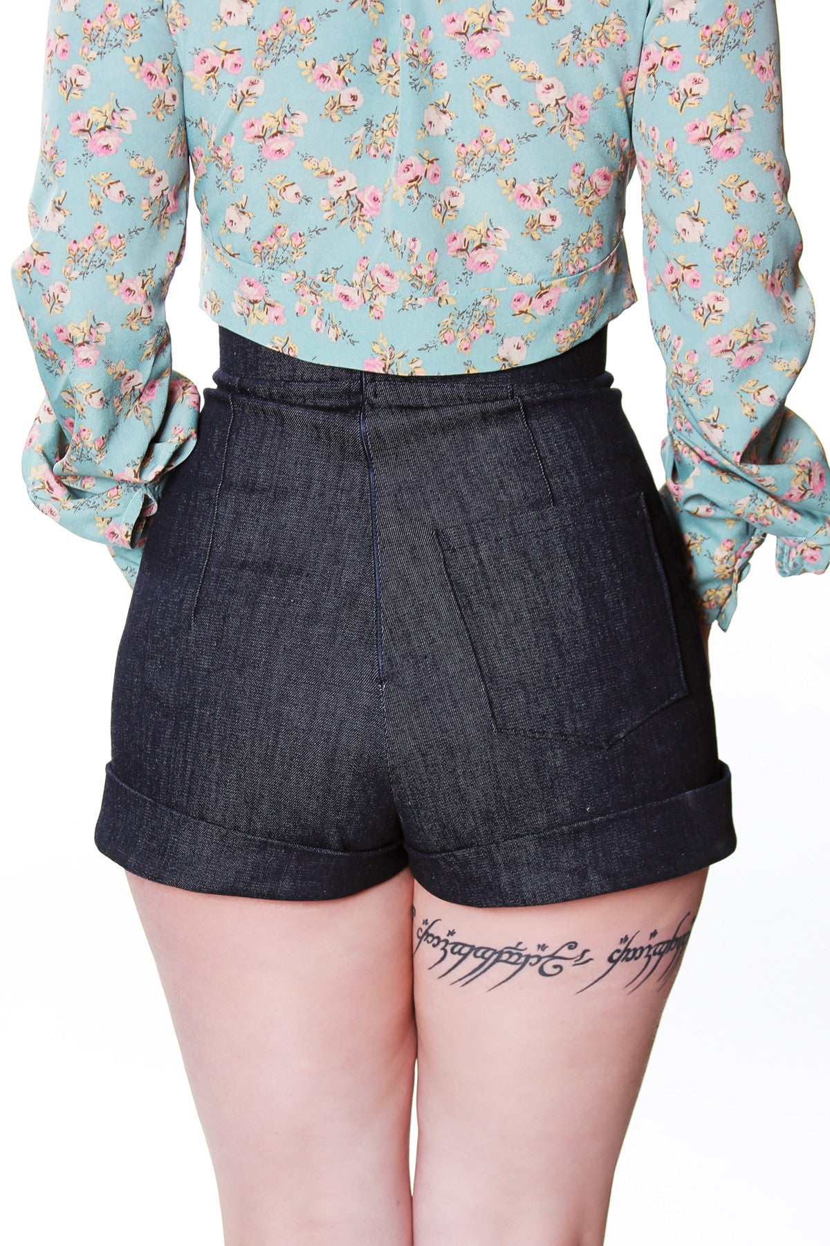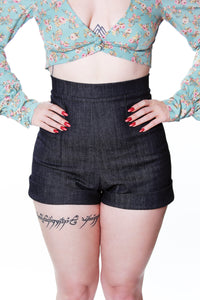 High waisted denim shorts with invisible zipper back closure,pin pleats,cuffs, and back pocket big enough for your cell phone. They pair perfectly with the Dollybird Halter top, or any tank.