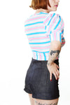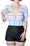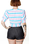 Candy bright pink and blue stripe on an ivory base nylon Striped Veronica top has cross over front, mid length short sleeve with a structured gather at shoulder and sleeve cuff. Fitted waist band and sleeve bands. Cute perfect top for any summer time bottom. I would pair this top with my high waisted denim shorts.