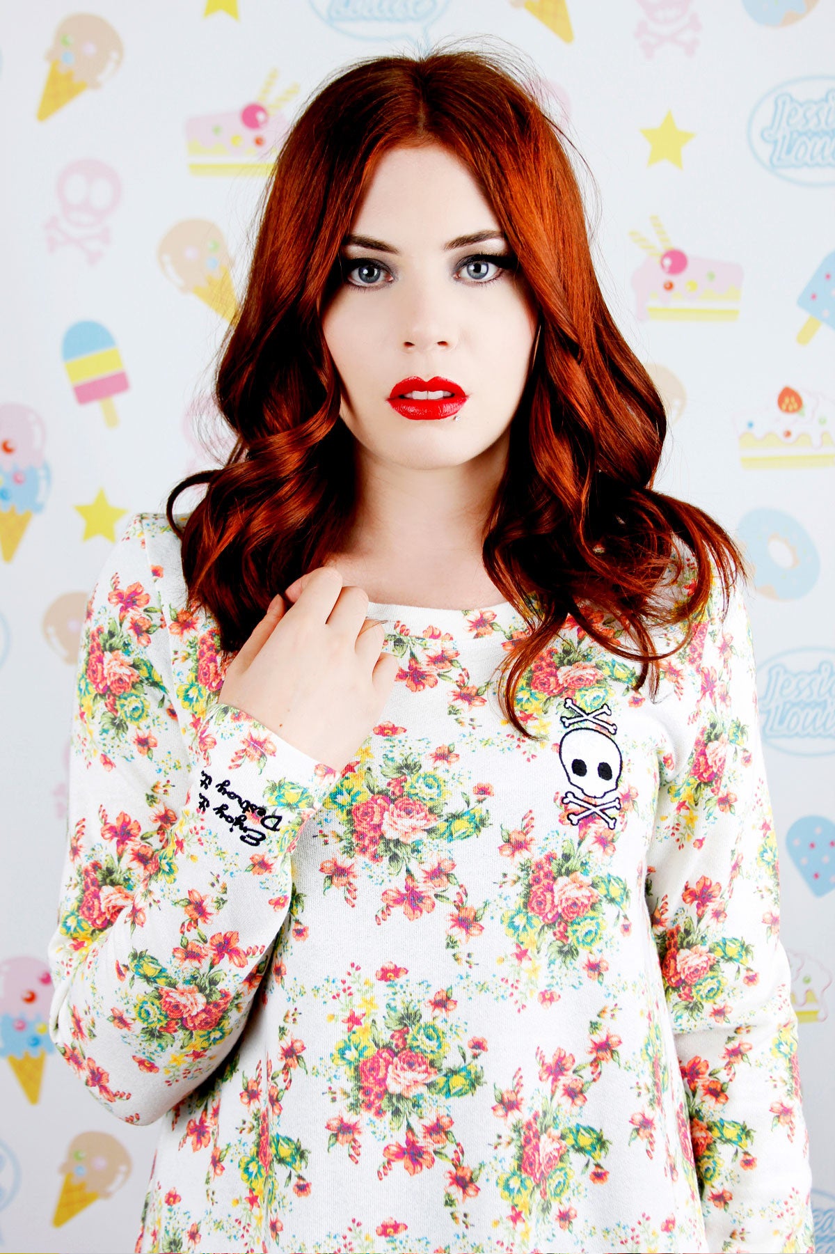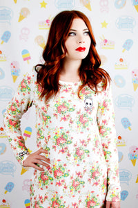 Cotton Floral French Terry, Oversize sweater slightly fitted at top with flare out bottom, So you still look adorable and not like you are wearing a potato sack. Made of Cotton French terry (soft and strechy) with Ebroidery skull and Text: Enjoy it. Destroy it. on sleeve