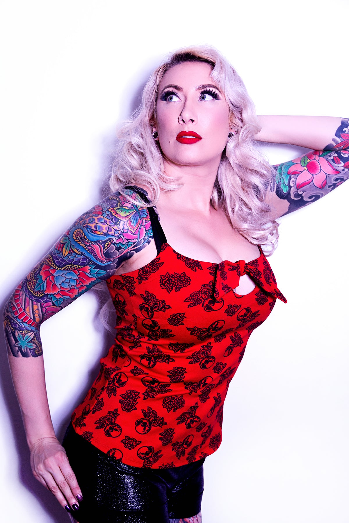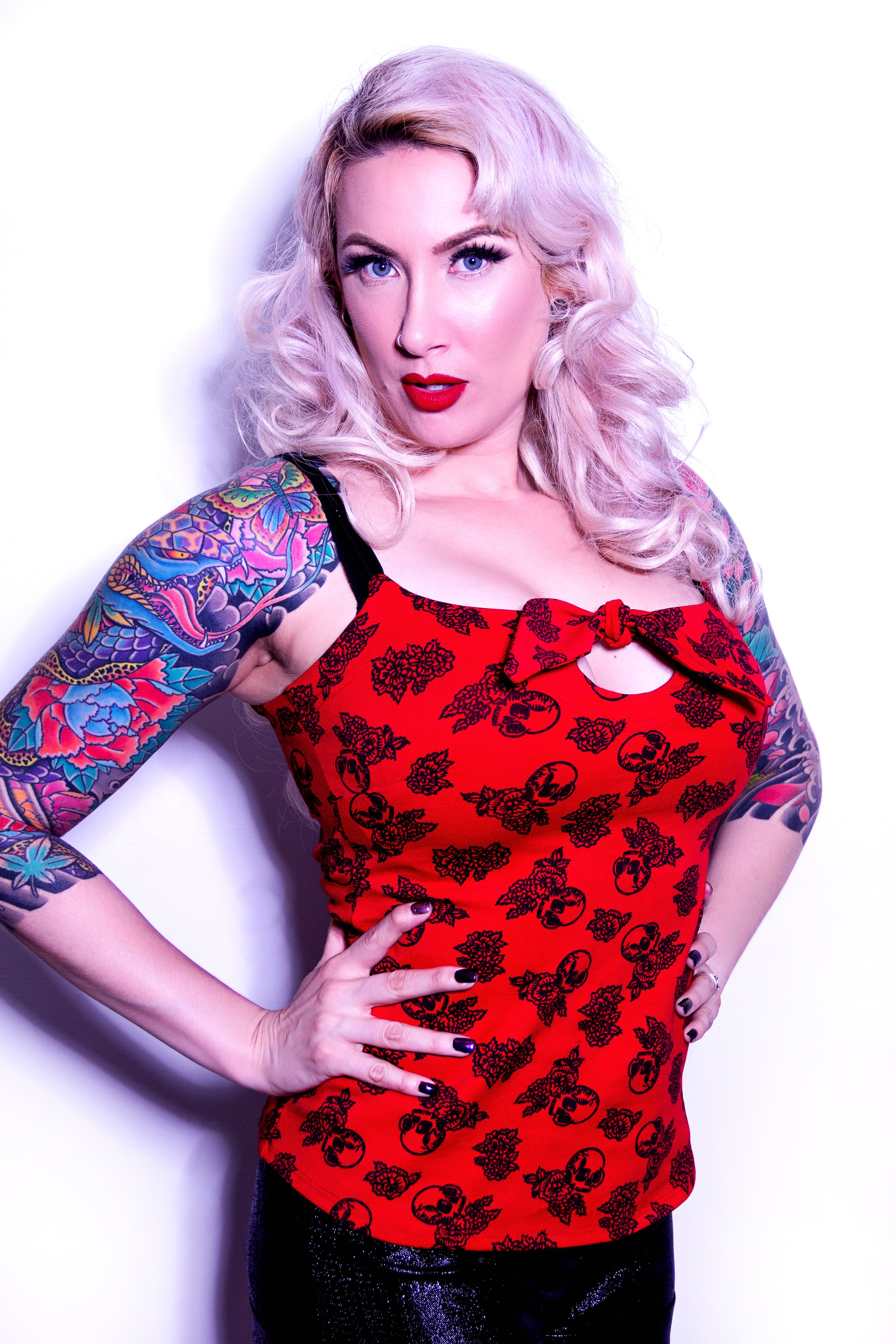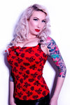 This little keyhole Top in Pink features a tie front keyhole flattering fitted shape and a is double washed custom printed designed by Jessica Louise limited edition skull rose print . A classic style that you'll just love, this little number is perfect for layering. Is made from a stretchy Rayon Ponte with a super comfortable fit. Pair with your favorite skirt for or jeans for an easy and adorable everyday fun look.