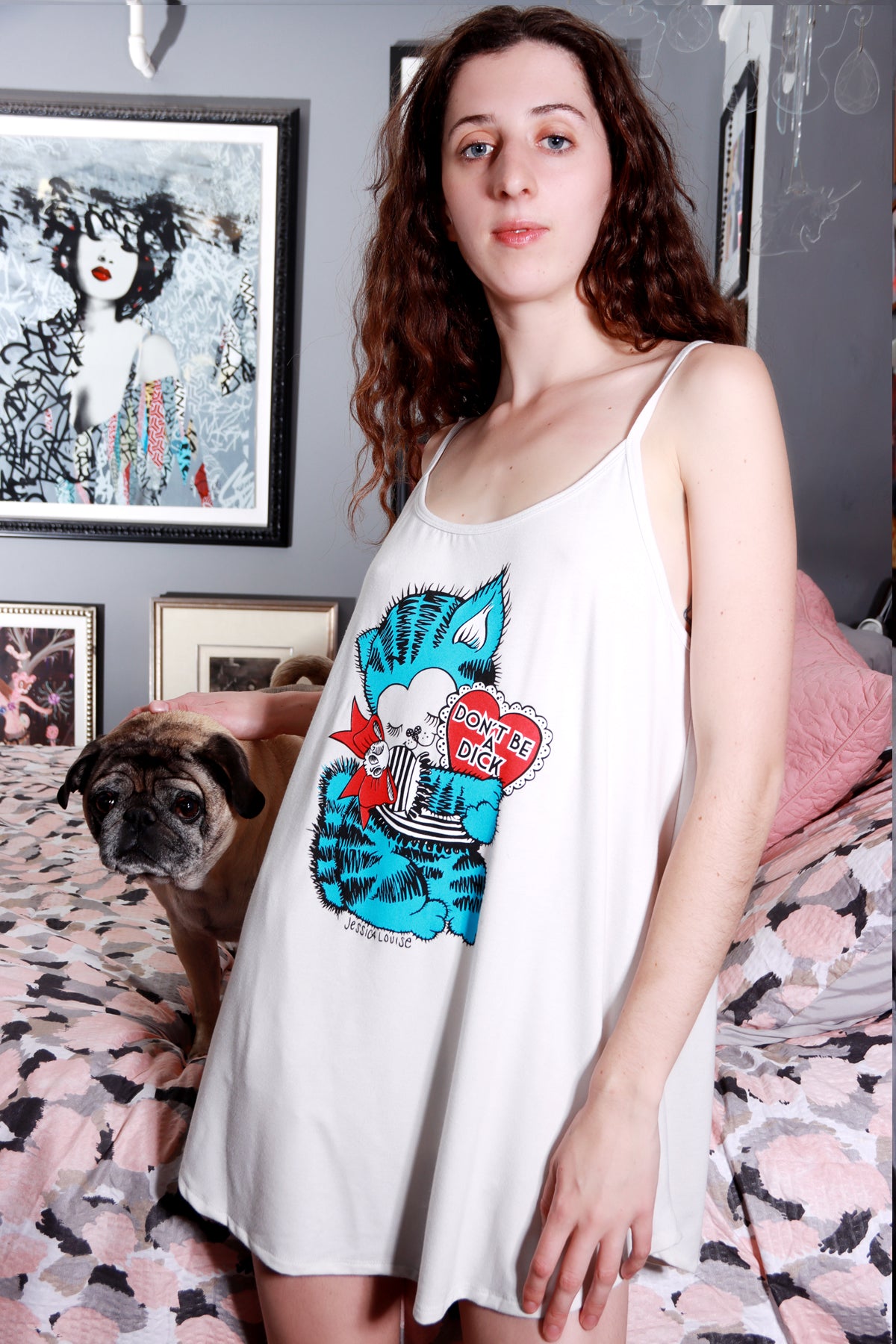Scoop neck front V-neck back spaghetti oversize cami with Don’t be a dick graphic print. Super soft stretch fabric.