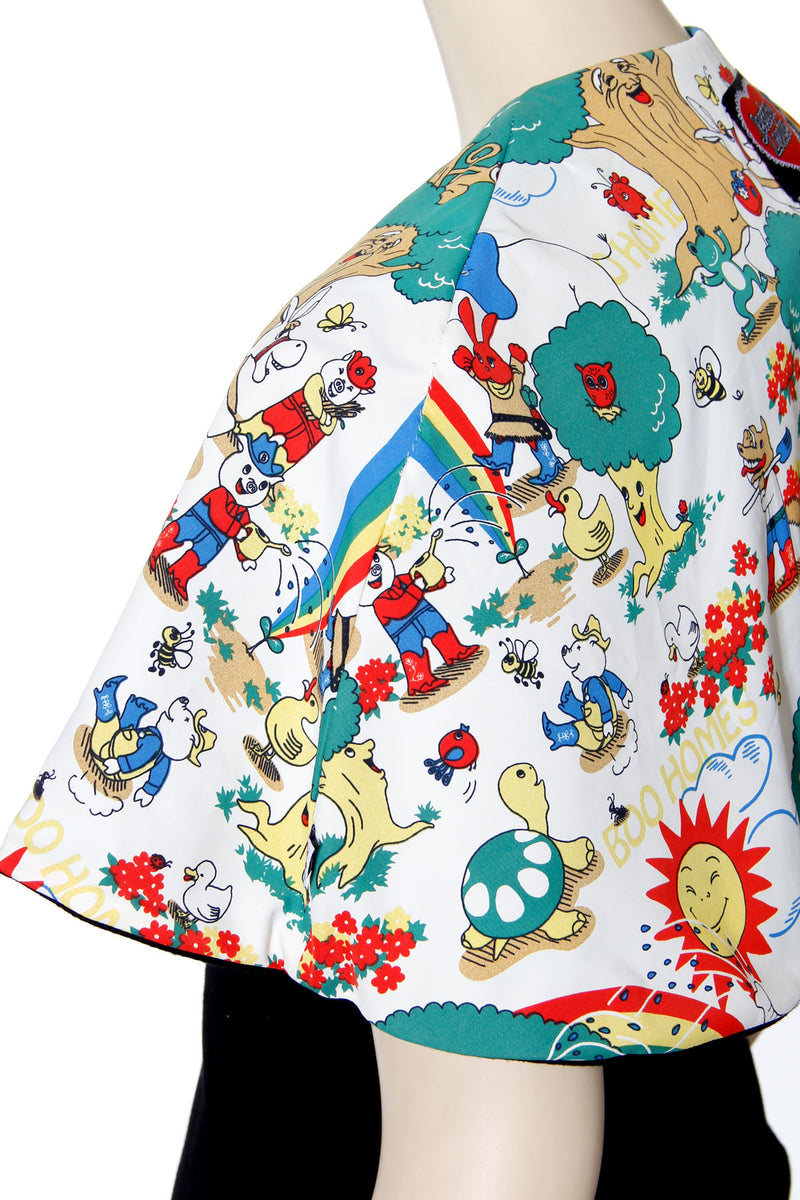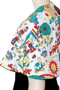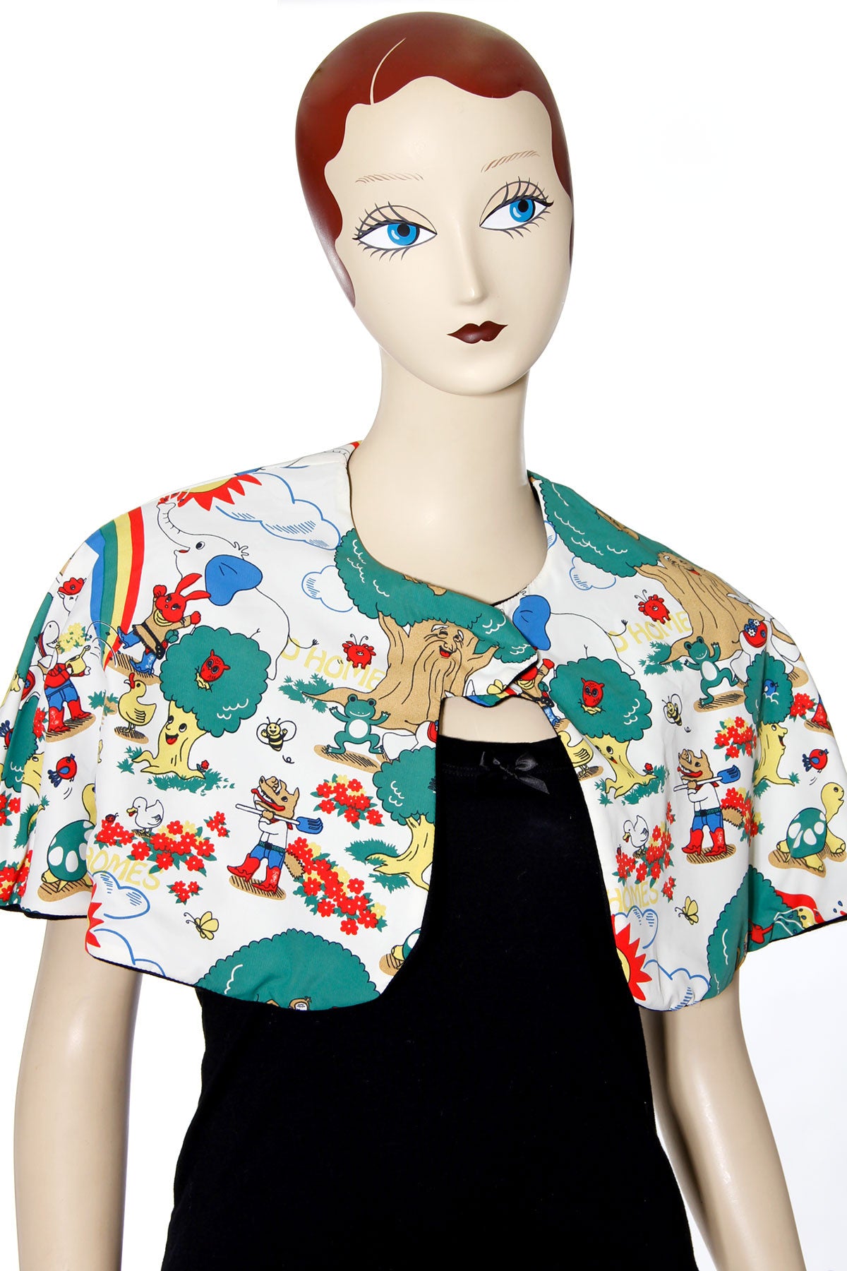 This soft Black Wool textile is lined with crazy storybook animals that kind of look like they know how to party liner. and has a 1.5" snap closure inside and outside adored by 2.5" Resin Vintage reproduction button. I searched high and low for both the snaps and buttons especially for this collection.