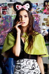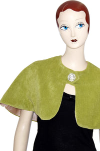 This soft textured Hansel & Gretel grass green textile is lined with champagne satin and has a 1.5" snap closure inside and outside adored by 1.5" Rhinestone vintage reproduction button. I searched high and low for both the snaps and buttons especially for this collection.
