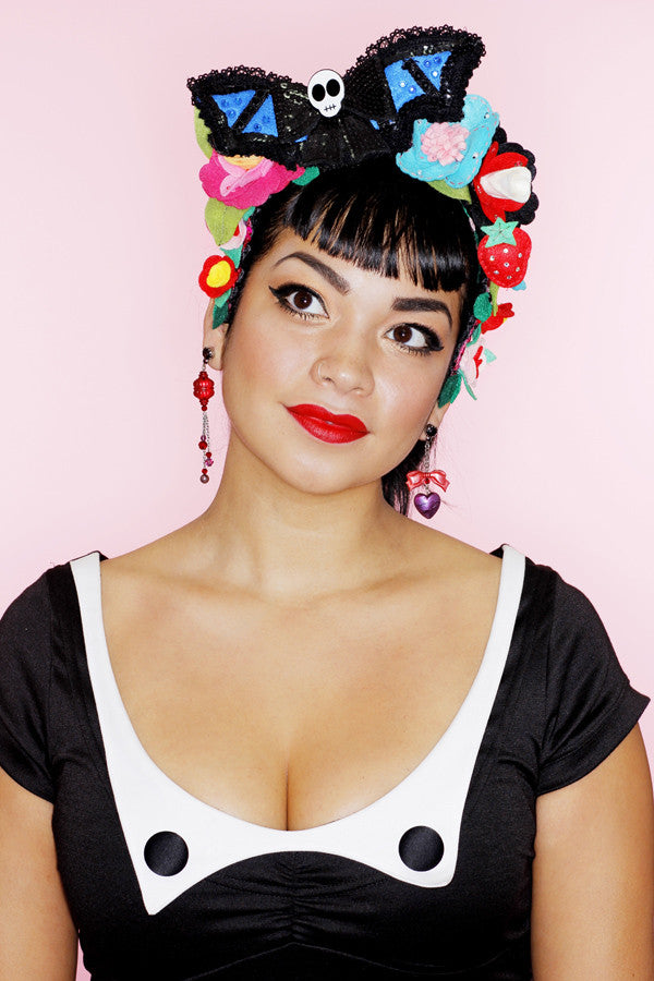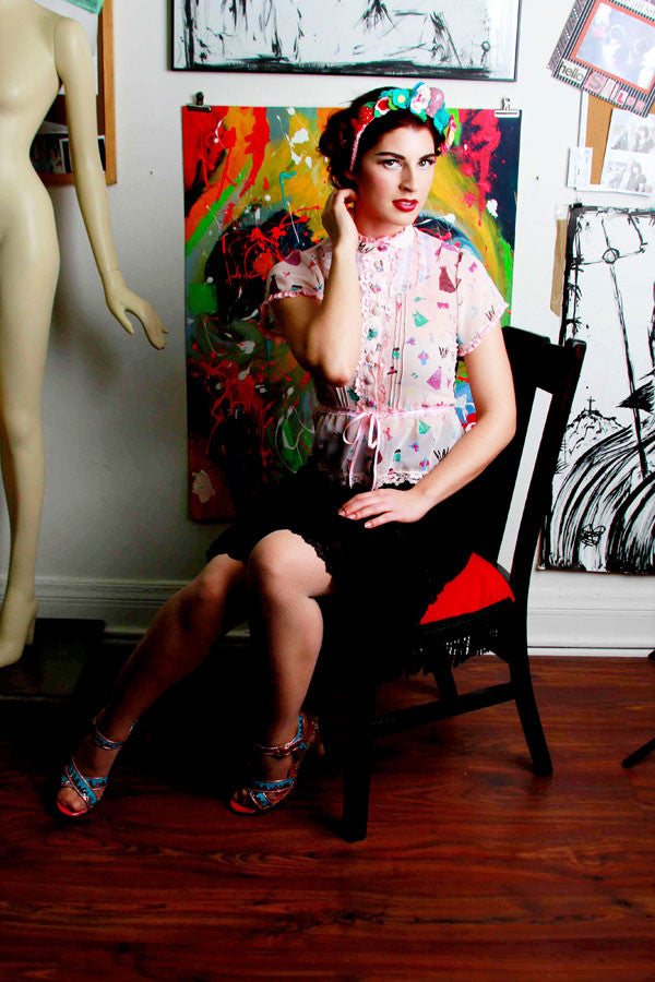 Limited Edition rayon blue with white polka dot pussy bow blouse with pearl button front and long sleeve with cuffs.
