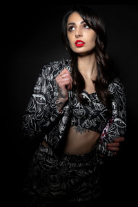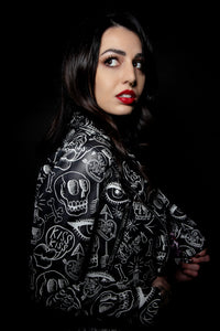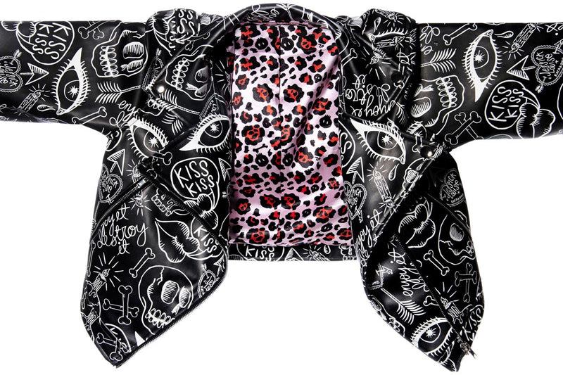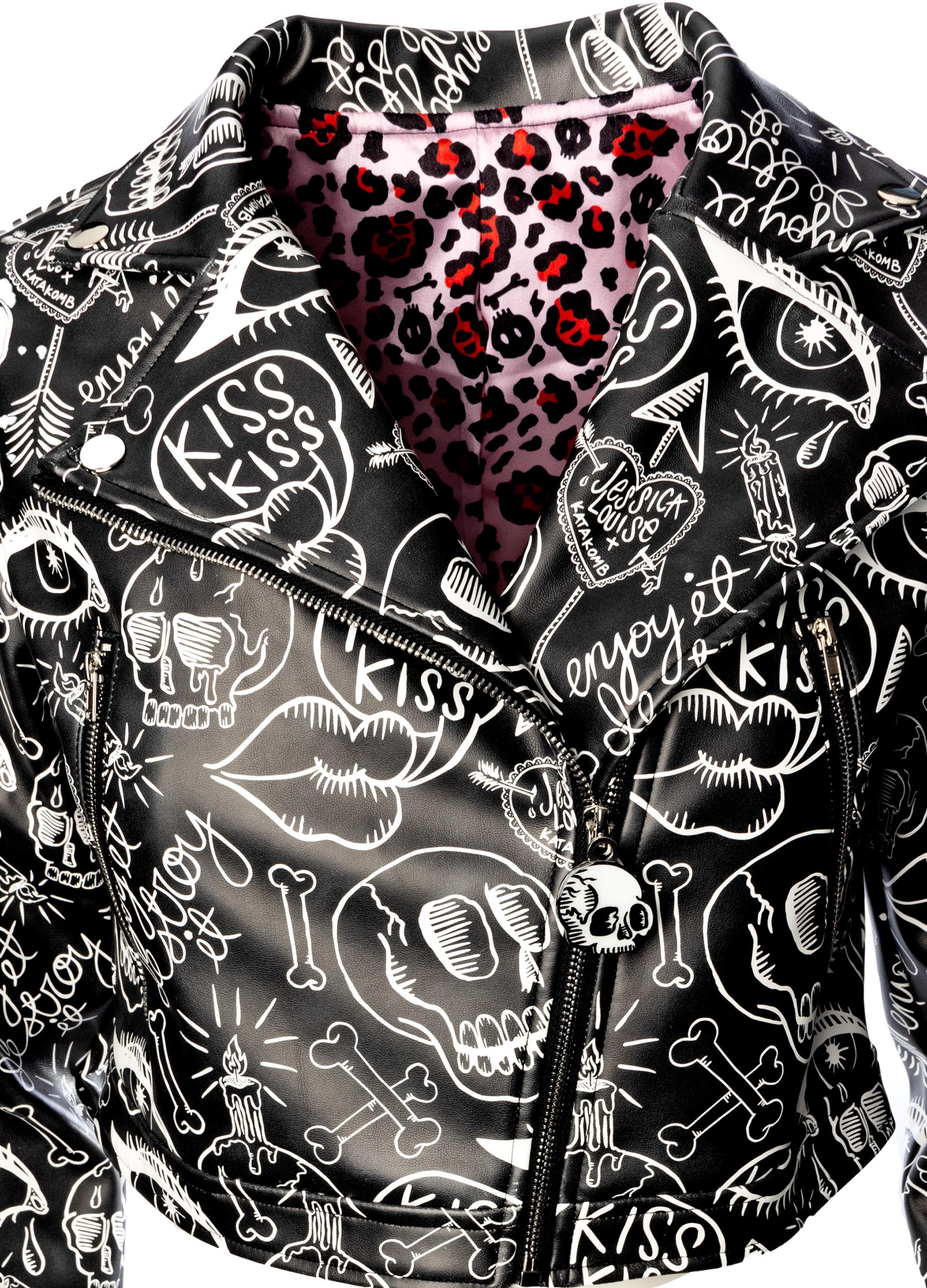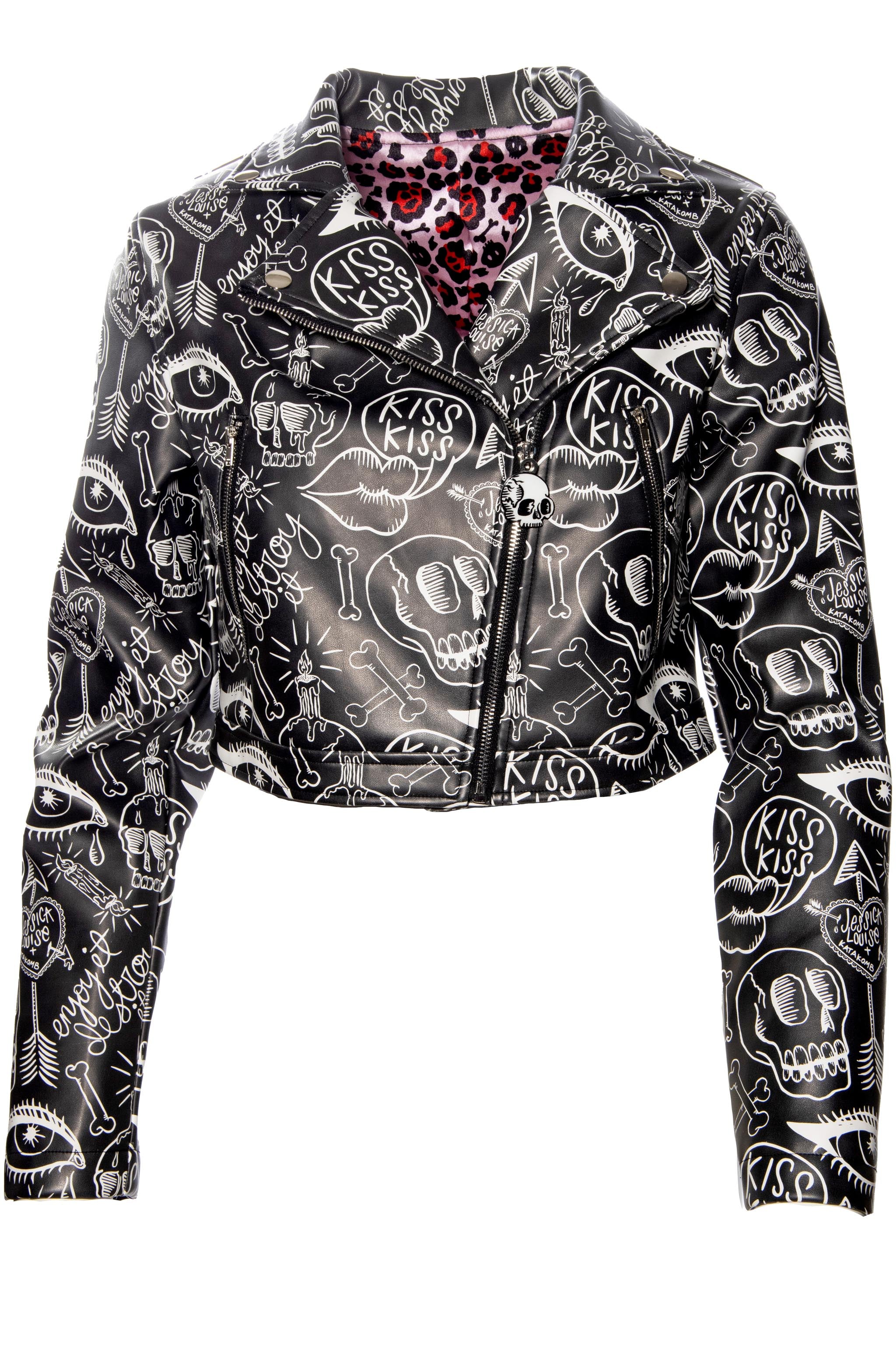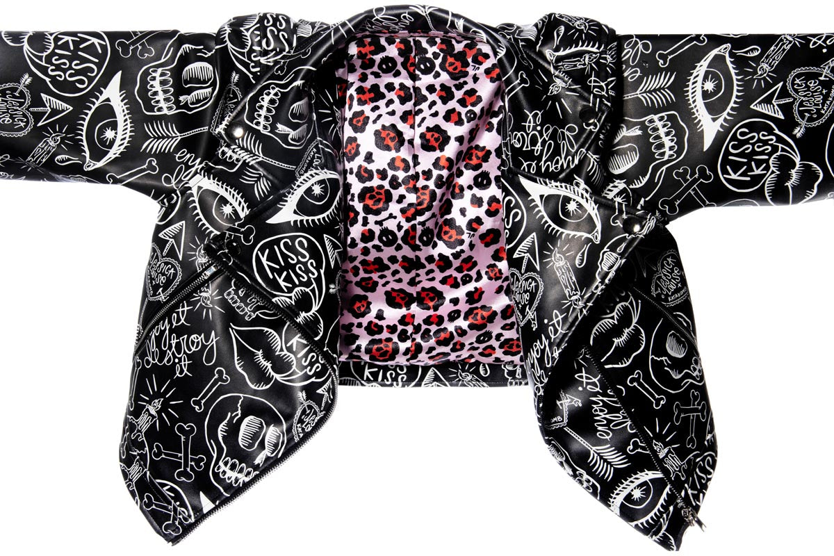 Crafted from vegan leather in a cropped silhouette, this jacket balances edgy style with everyday functionality. The exterior features Jessica Louise’s bold graffiti artwork, while the inside is fully lined with her original, copyrighted Skull Leopard Print—adding a secret touch of wild attitude.