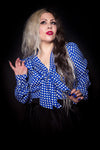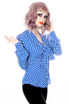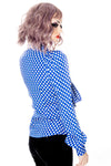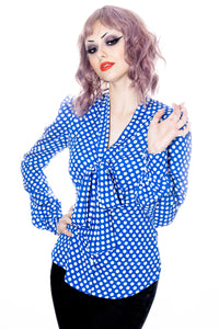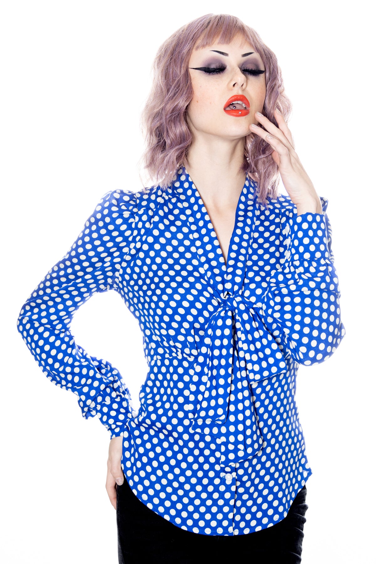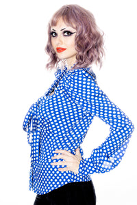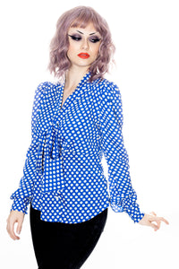 Limited Edition rayon blue with white polka dot pussy bow blouse with pearl button front and long sleeve with cuffs.