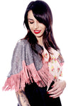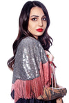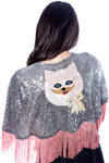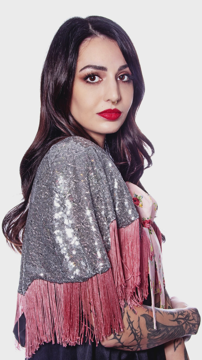 An ultra-exclusive steel gray sequin caplete, designed with a sequin cat applique and tailored rose chainette fringe. An exquisite satin rose-on-rose print bow tie front finished the look. Perfect for any fashion moment. O/S