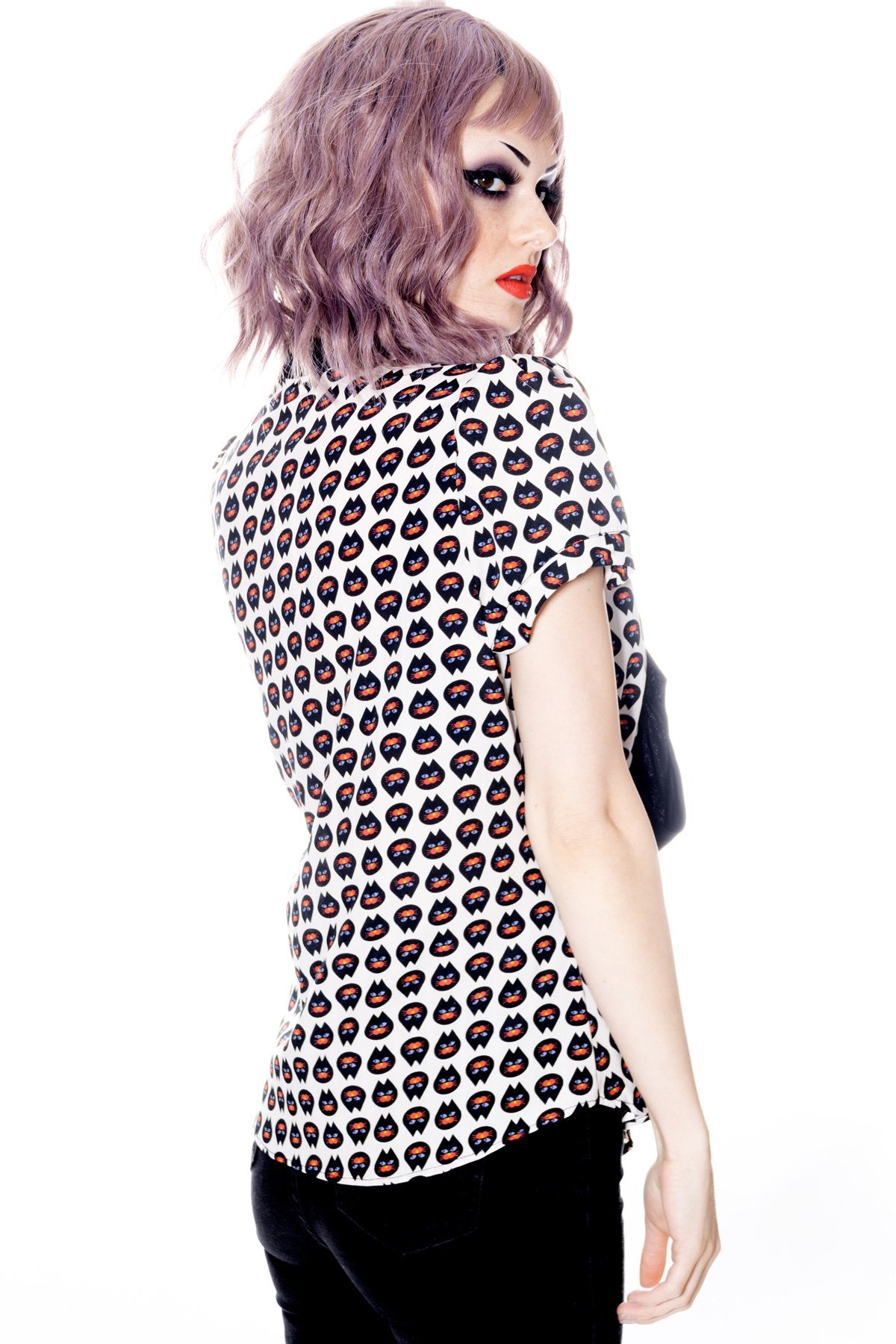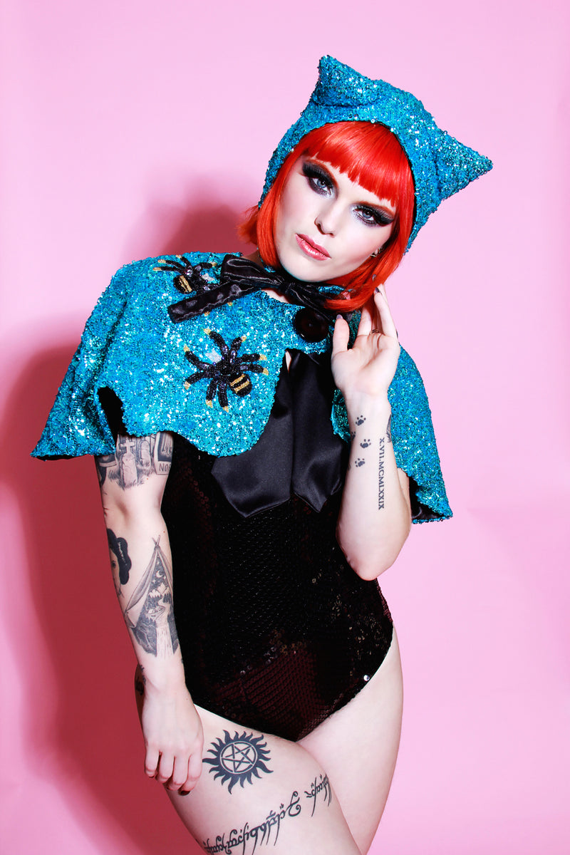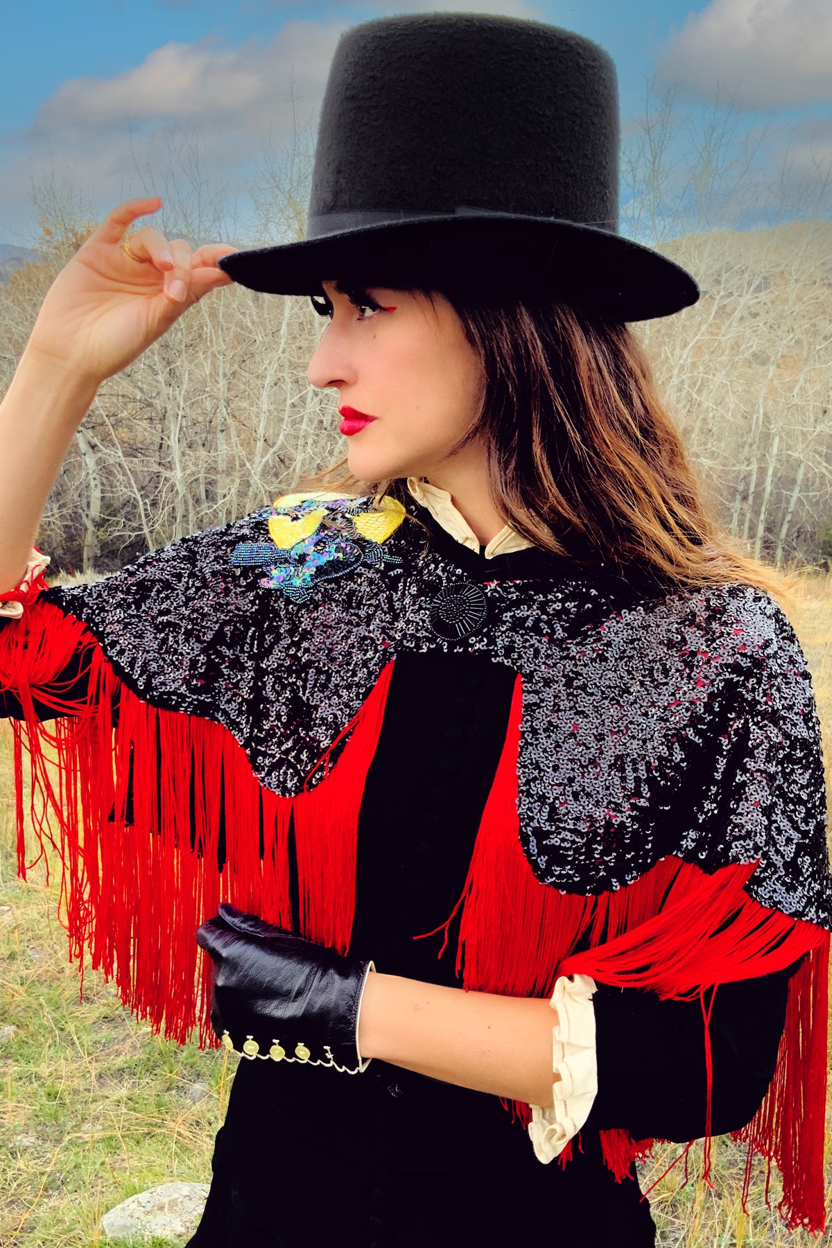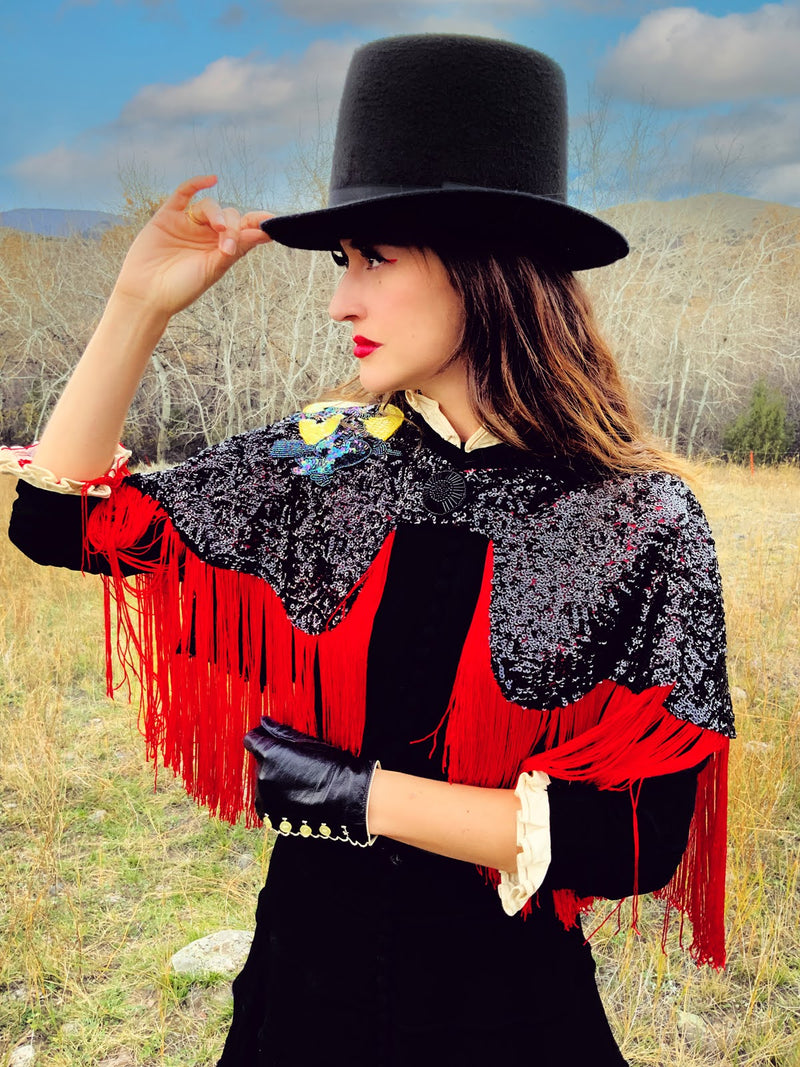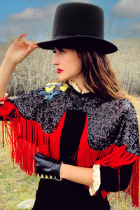 Very limited edition black sequin caplete with flying witch applique and tailored blood red chainette fringe .