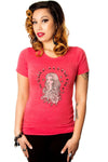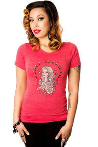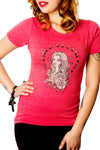 These are hand printed in my studio, made of super soft gorgeous shade of red cotton. Print is a discharge print ( bleached out instead of printed. The off white is actaully the base color of the red.) And reduced plastisol outline on top.
