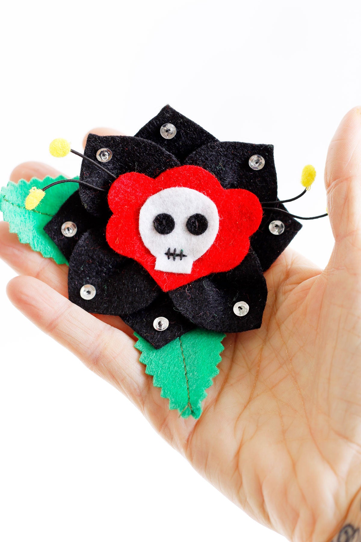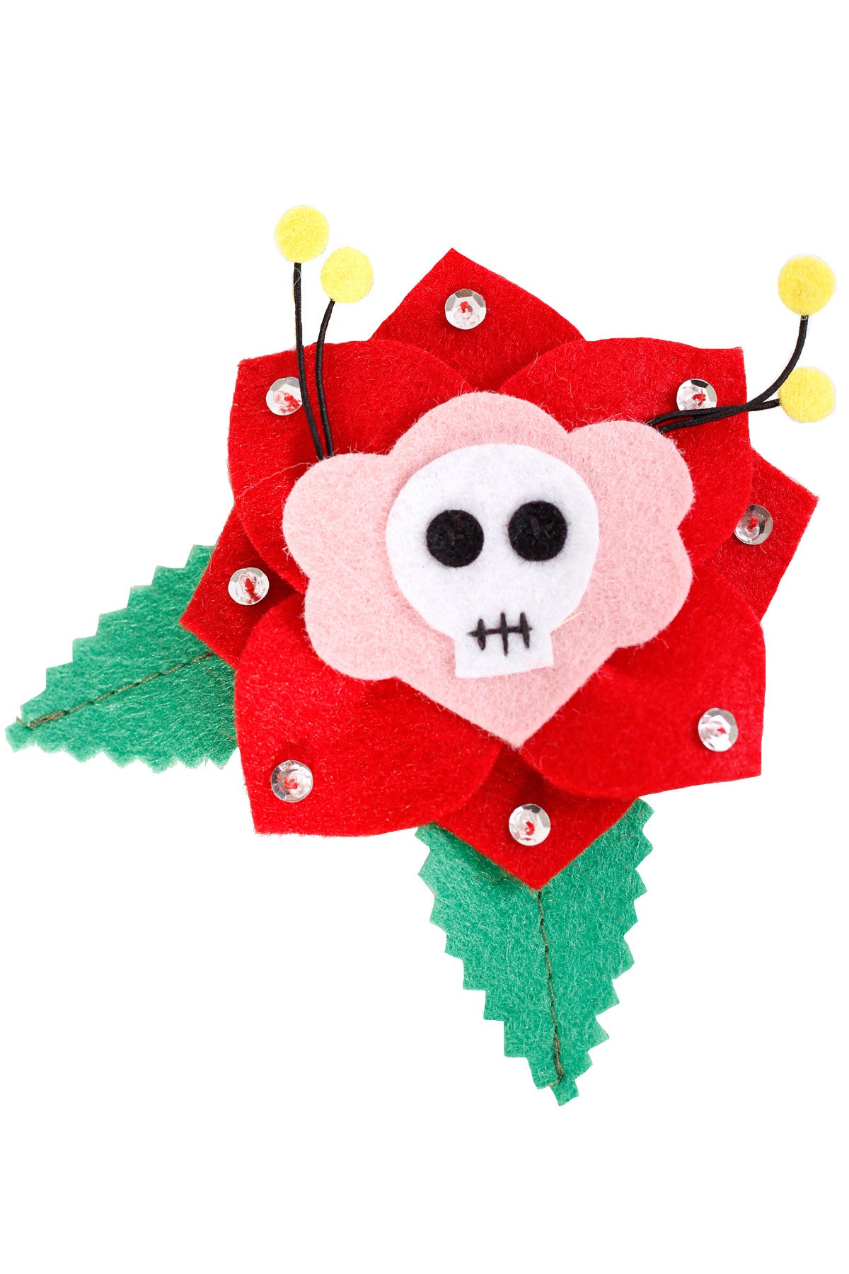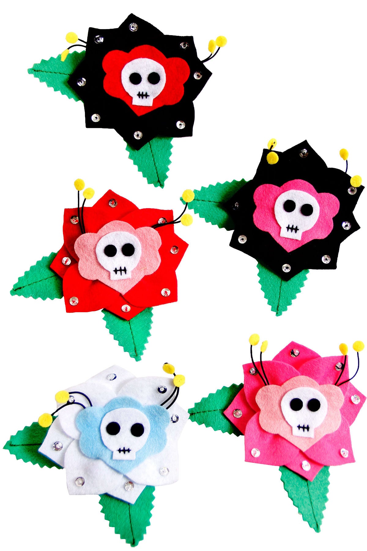 Jessica Louise Felt Rose and skull hairclip. Available in five colors. Rose is 3.5"x3.5"