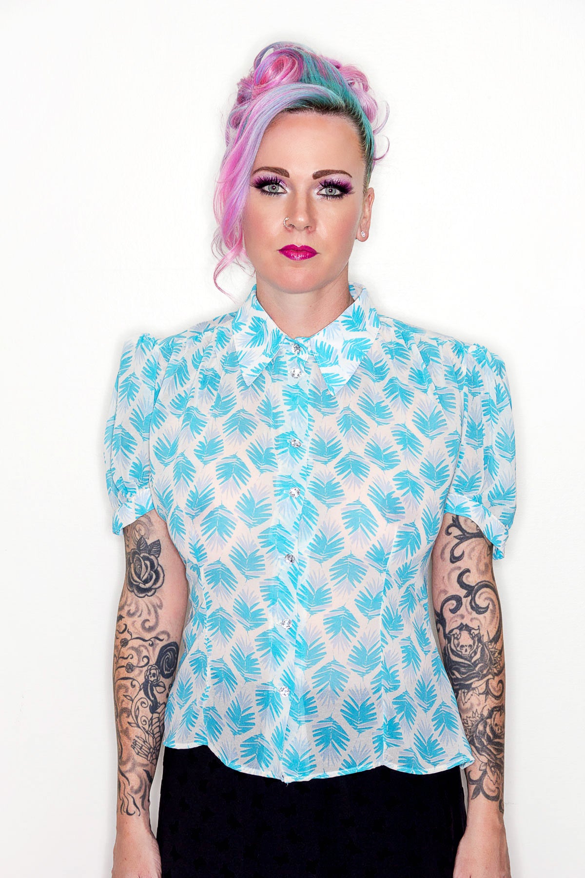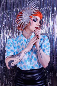 This cap-sleeve button-up blouse is adorned with a stunning blue palm leaf print. Due to its limited fabric, it is made-to-order.